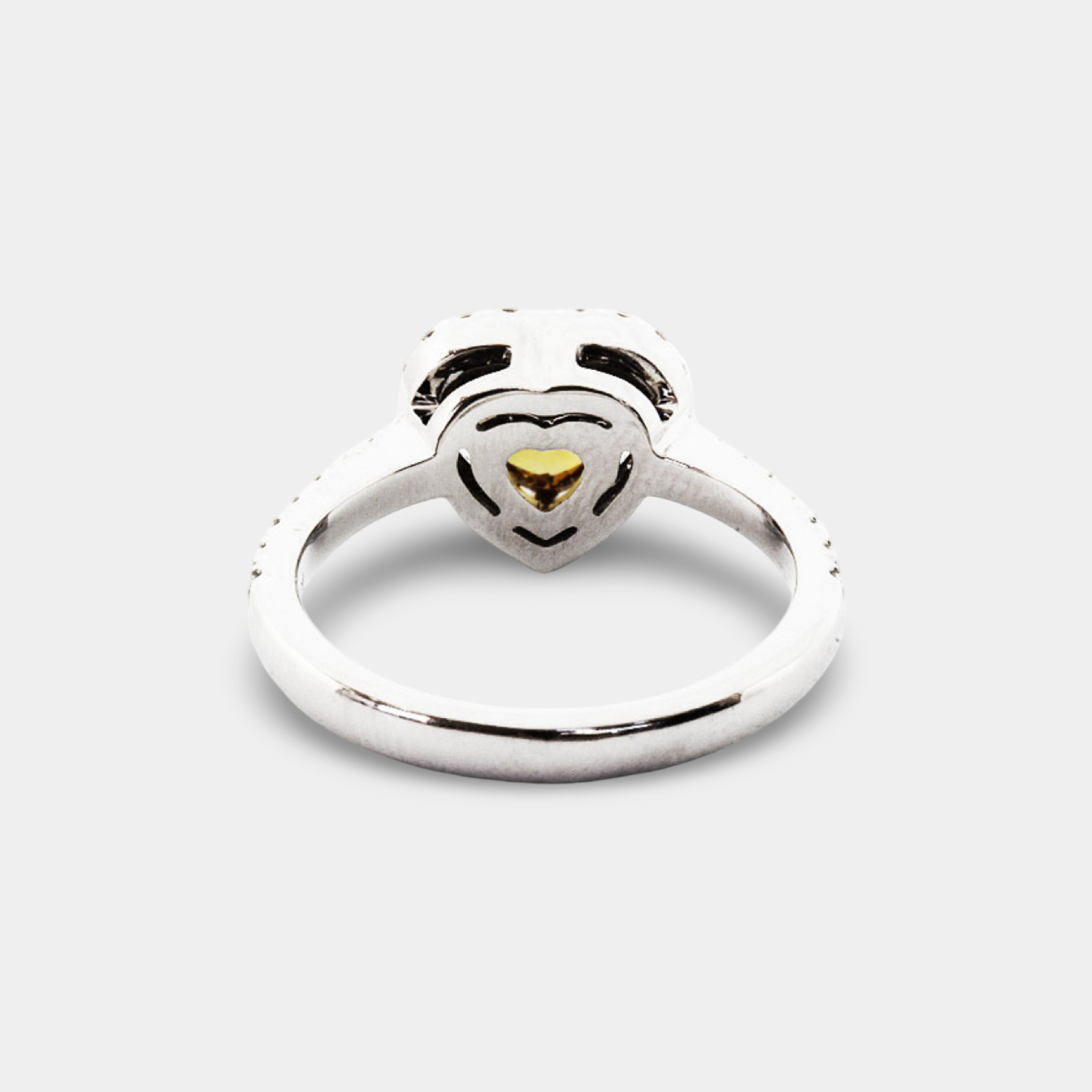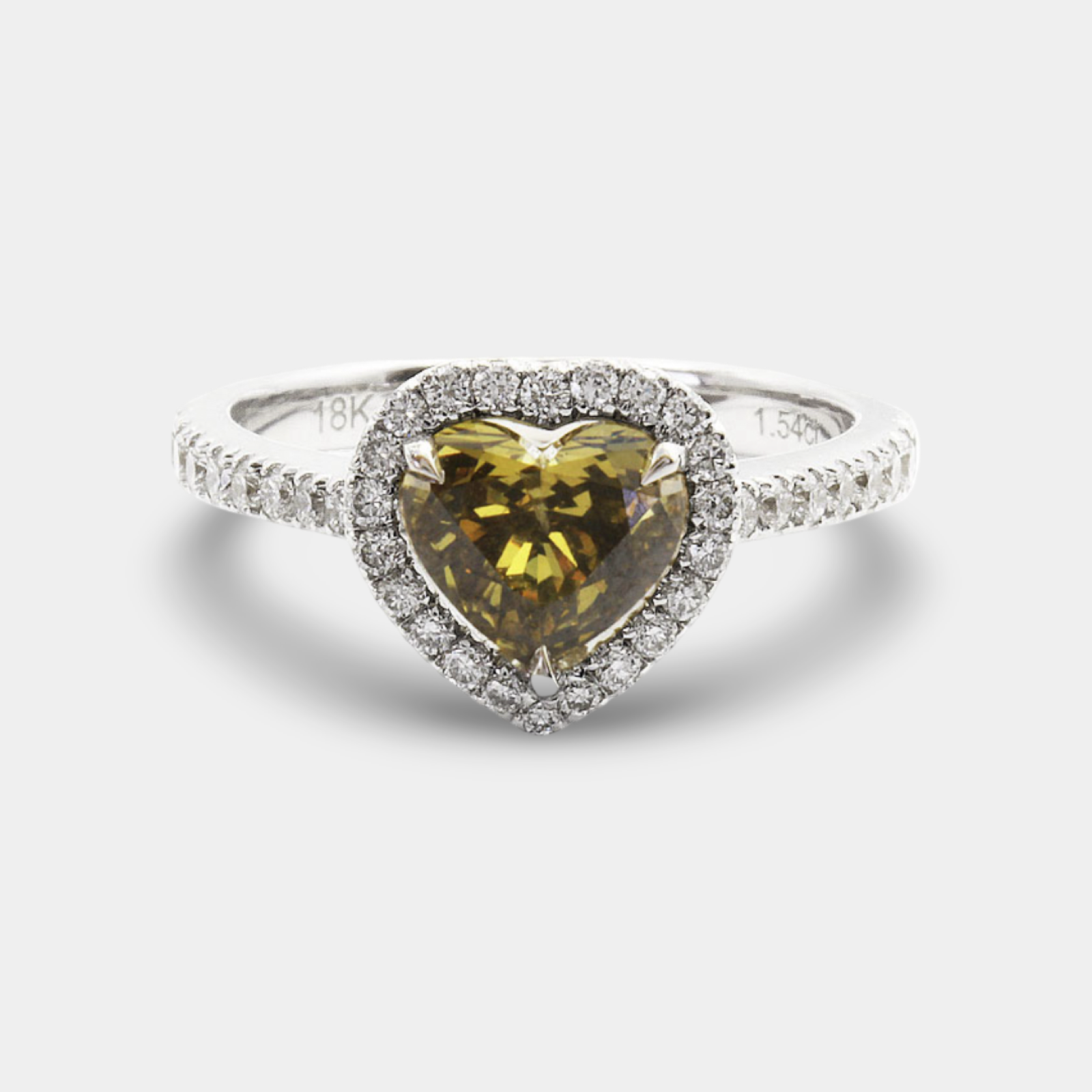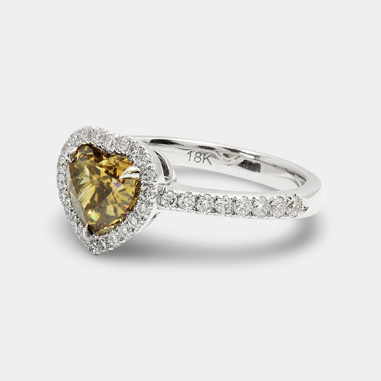 An 18-karat gold ring with a rare yellow-brown heart diamond, surrounded by a halo and an arm set with white diamonds for an elegant and impressive appearance.