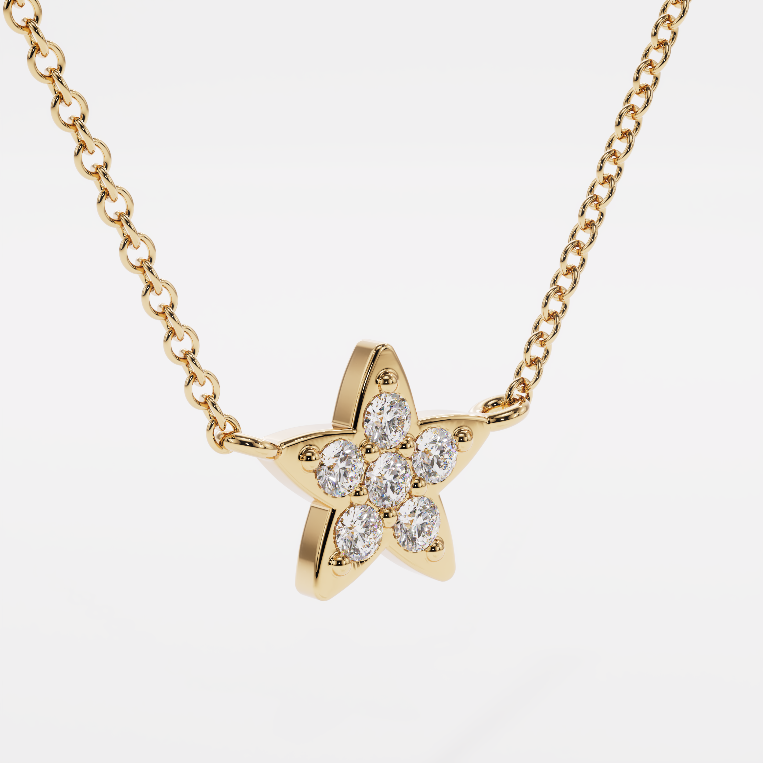 A delicate 14k gold necklace with a five-pointed star-shaped pendant, set with round natural diamonds. At each end of the star is a sparkling diamond, and in its center is another cluster of diamonds that enhances the shine and symmetry of the design. The combination of smooth golden lines and the shimmer of the glow creates a magical, elegant and timeless piece of jewelry with a heavenly scent. Pendant size: 10 mm Carat weight: 0.18 carats