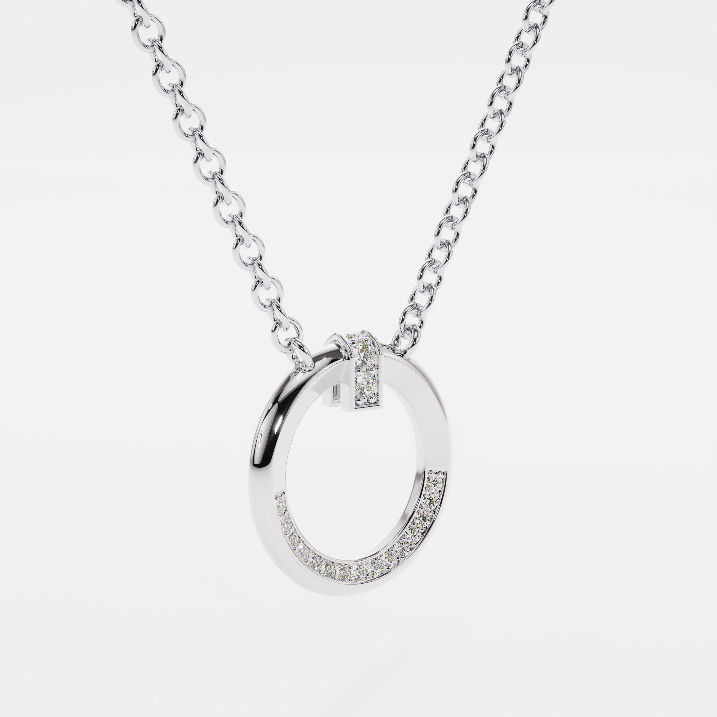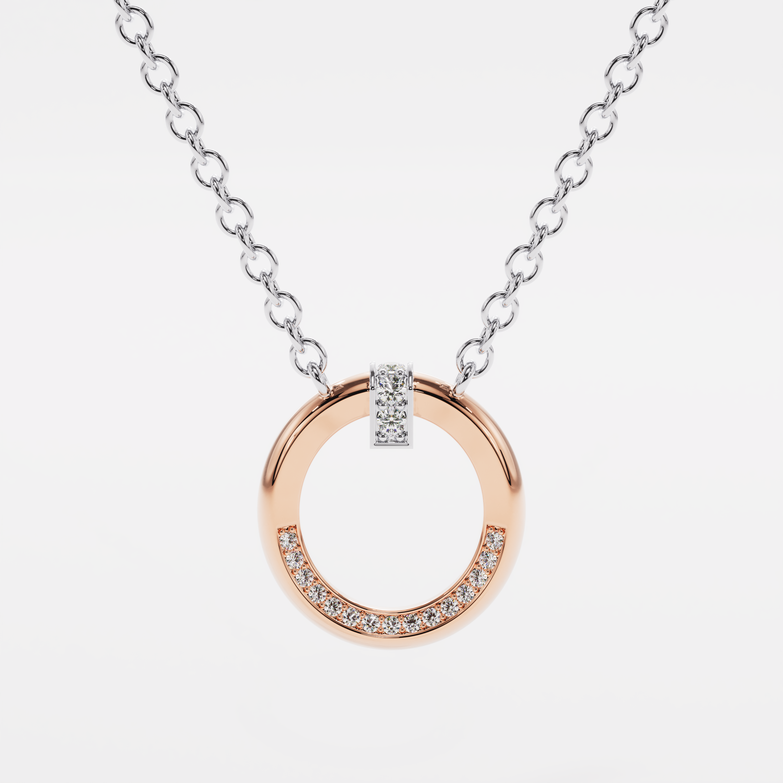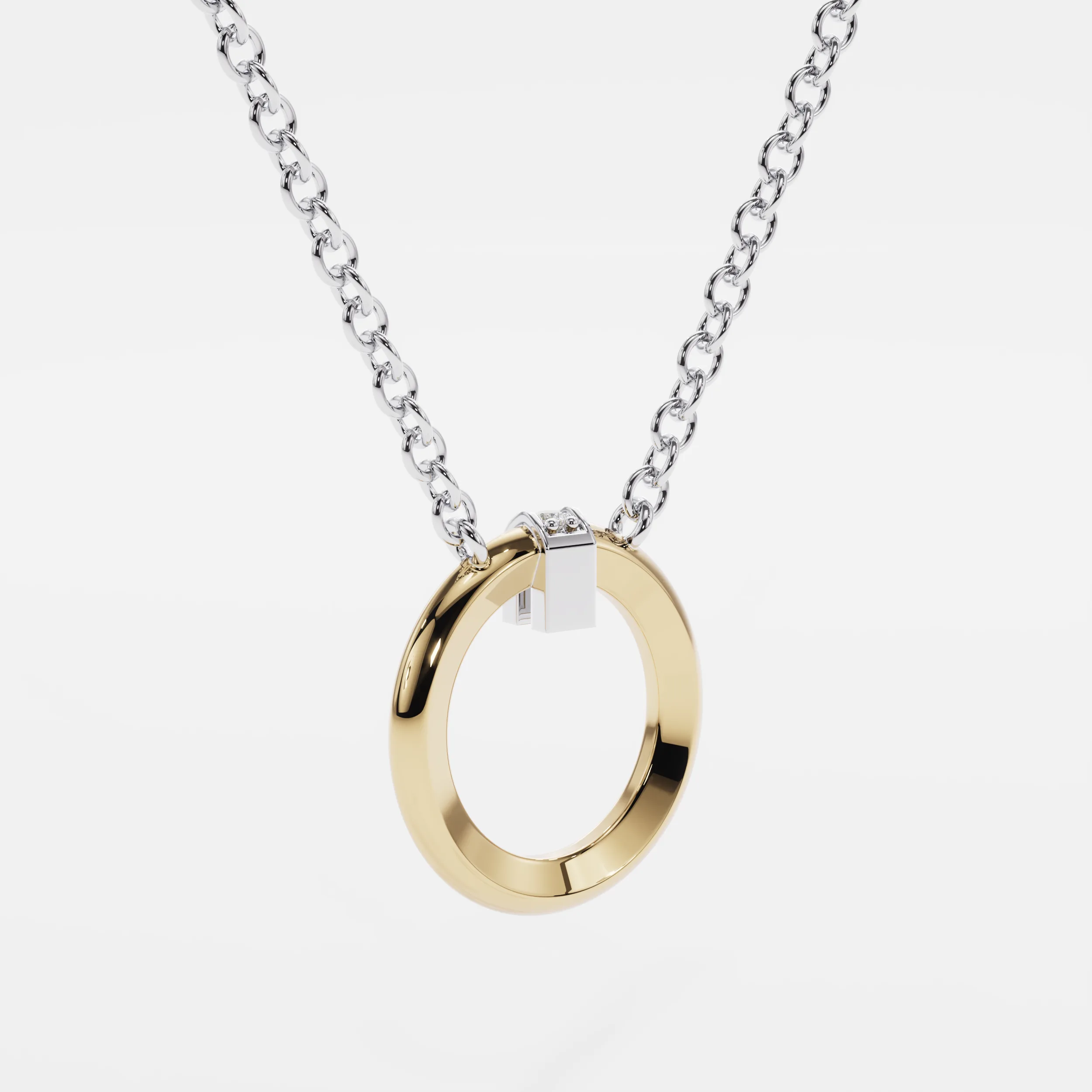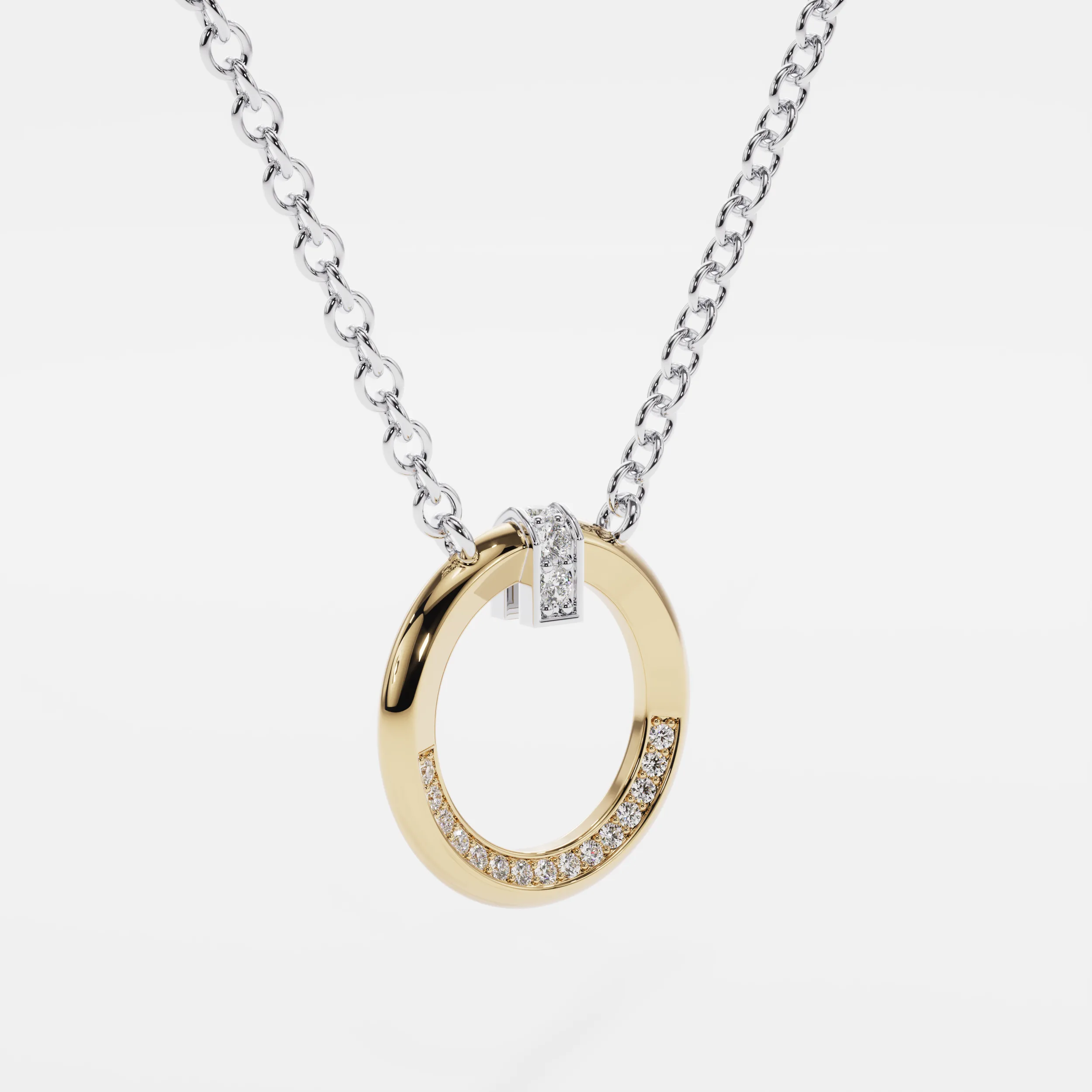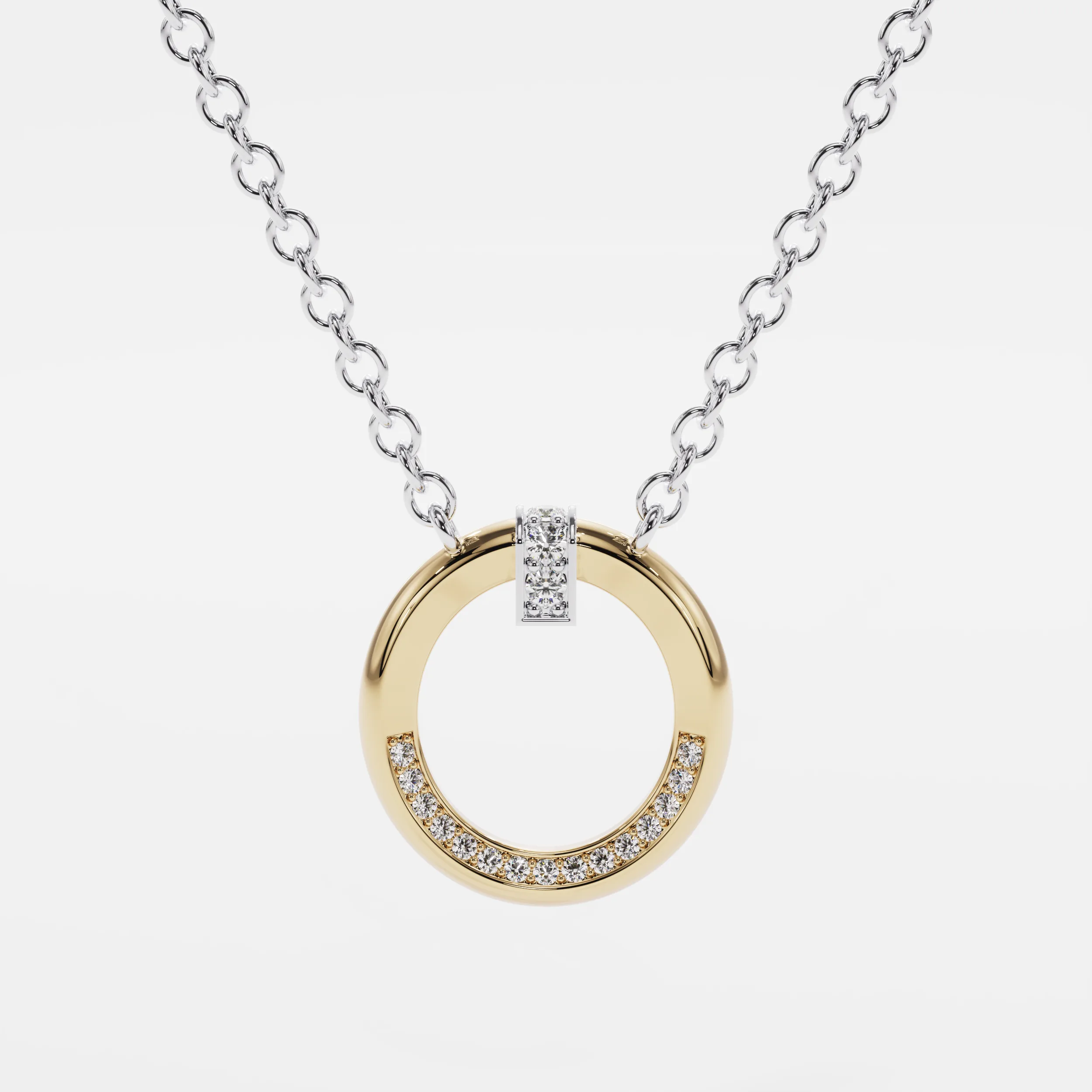 תליון עגול מזהב צהוב 14 קראט עם יהלומים טבעיים, מחובר לשרשרת זהב לבן. עיצוב קלאסי ואלגנטי המסמל שלמות, שפע ואהבה.