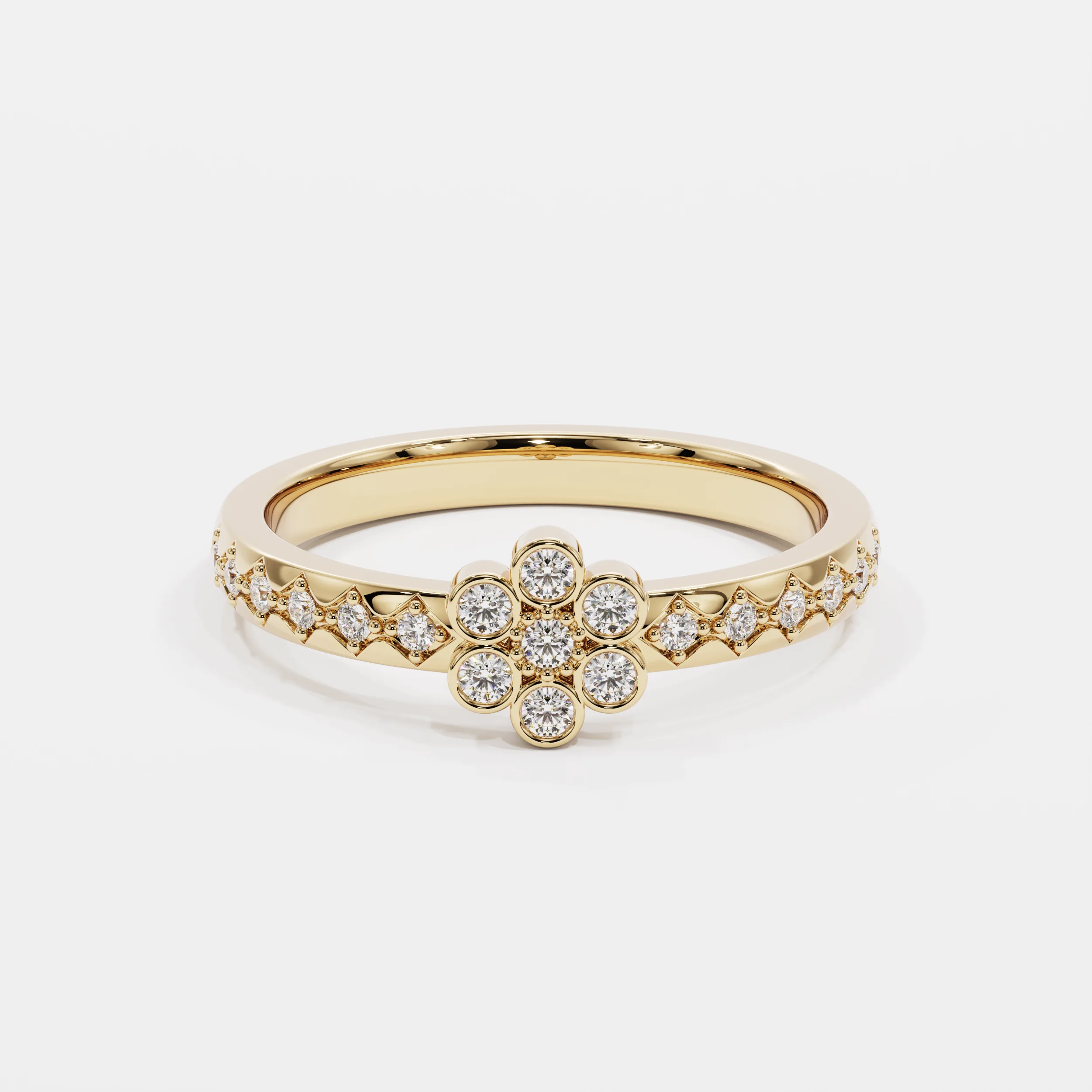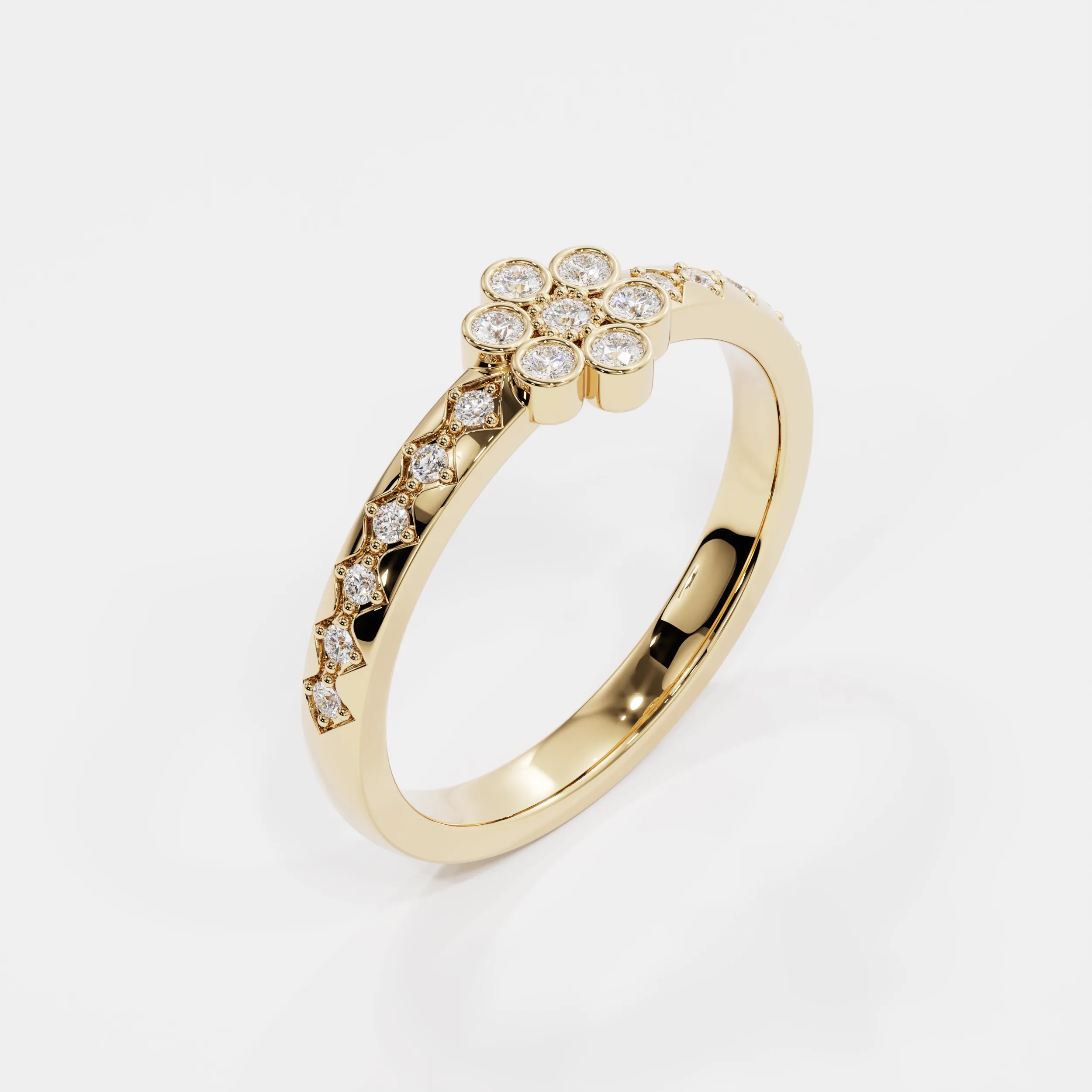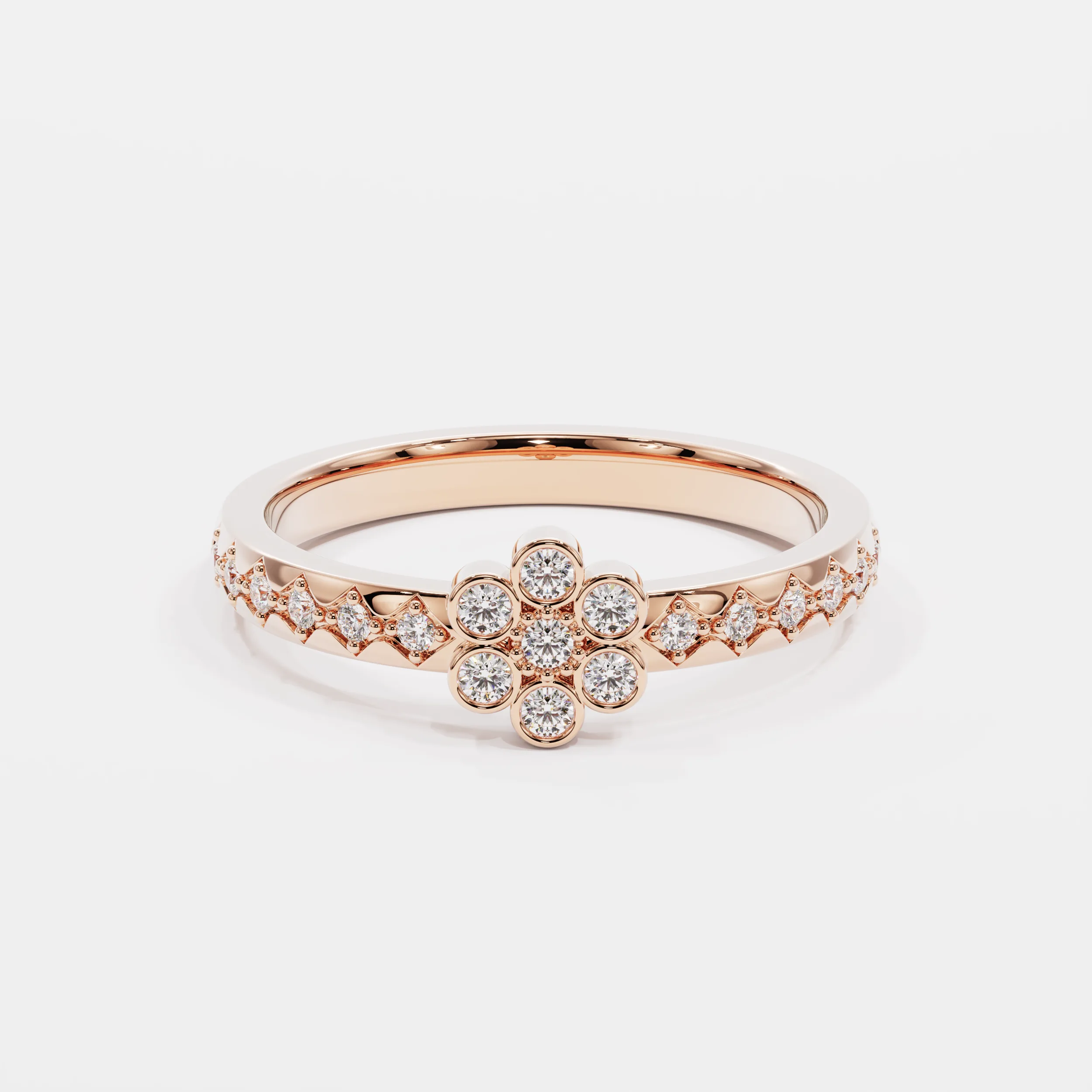 טבעת אלגנטית בעבודת צורפות מדויקת, עם שורת יהלומים עדינים המשובצים לאורך החישוק. במרכזה נמצא מוטיב פרח מעוגל, המורכב מיהלומים עגולים בליטוש מבריק, המסודרים בהרמוניה סימטרית מושלמת. השיבוץ המדורג סביב הפרח מוסיף עומק ותחכום. שילוב הרמוני של רוך ועוצמה – קלאסיקה מודרנית שקשה להוריד ממנה את העיניים.