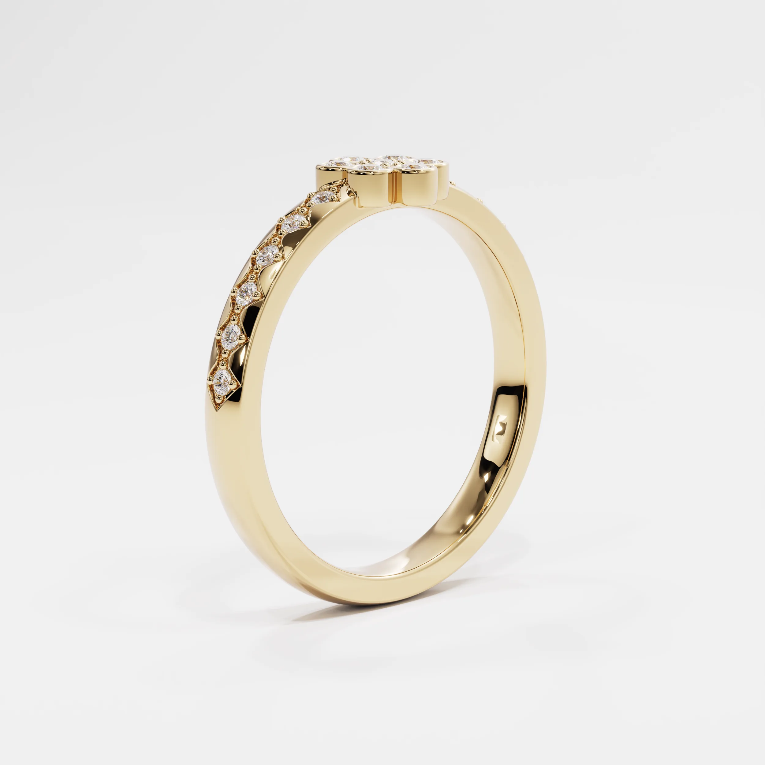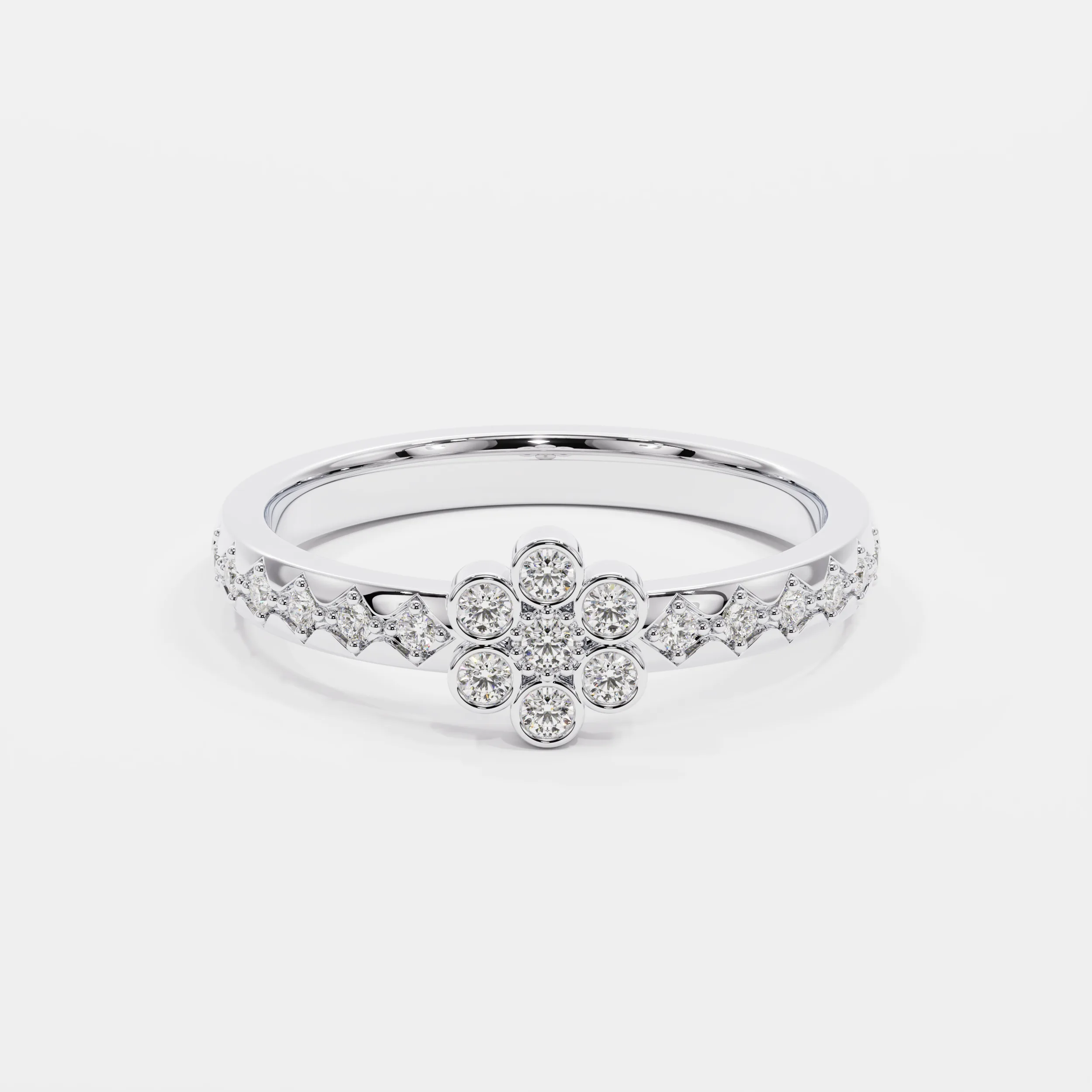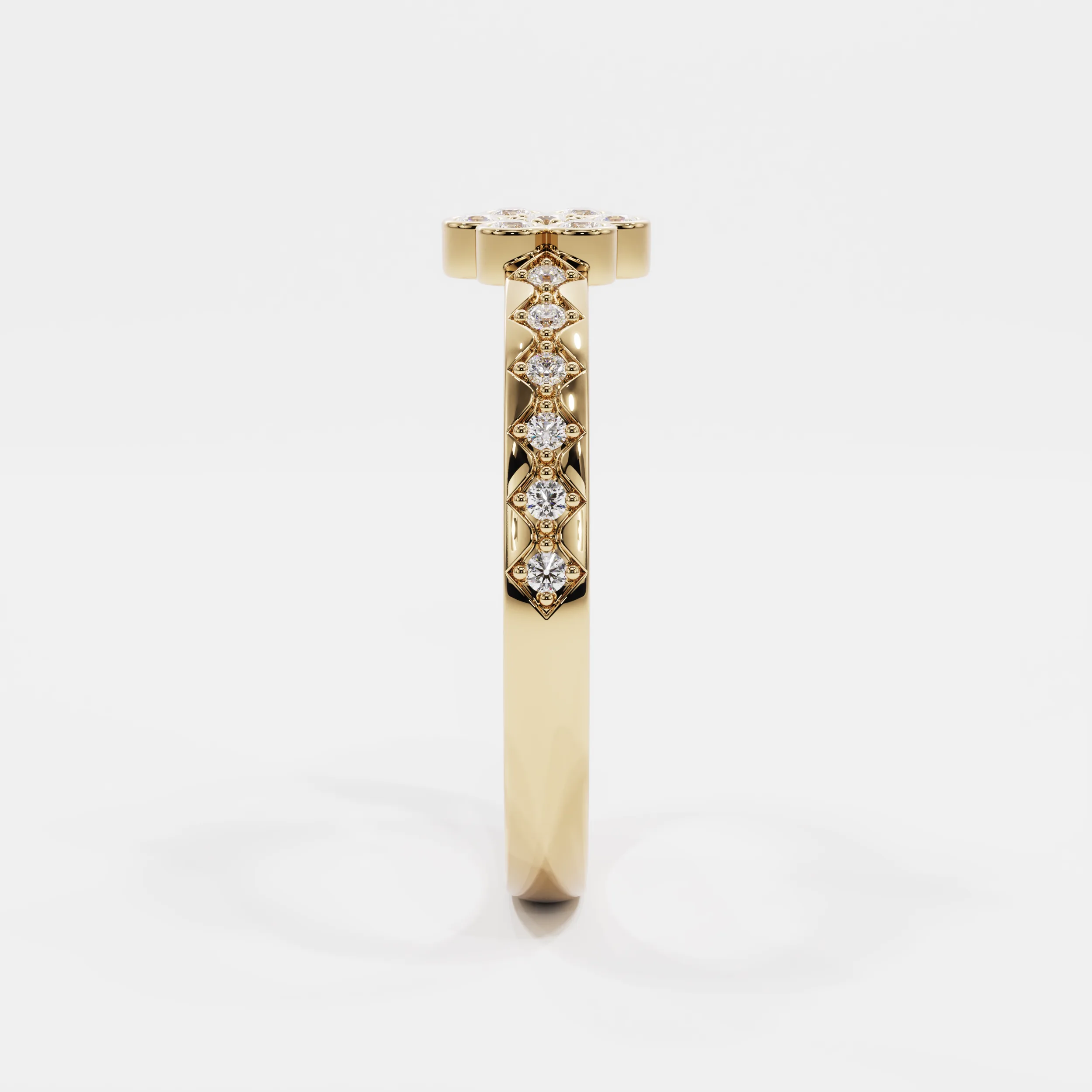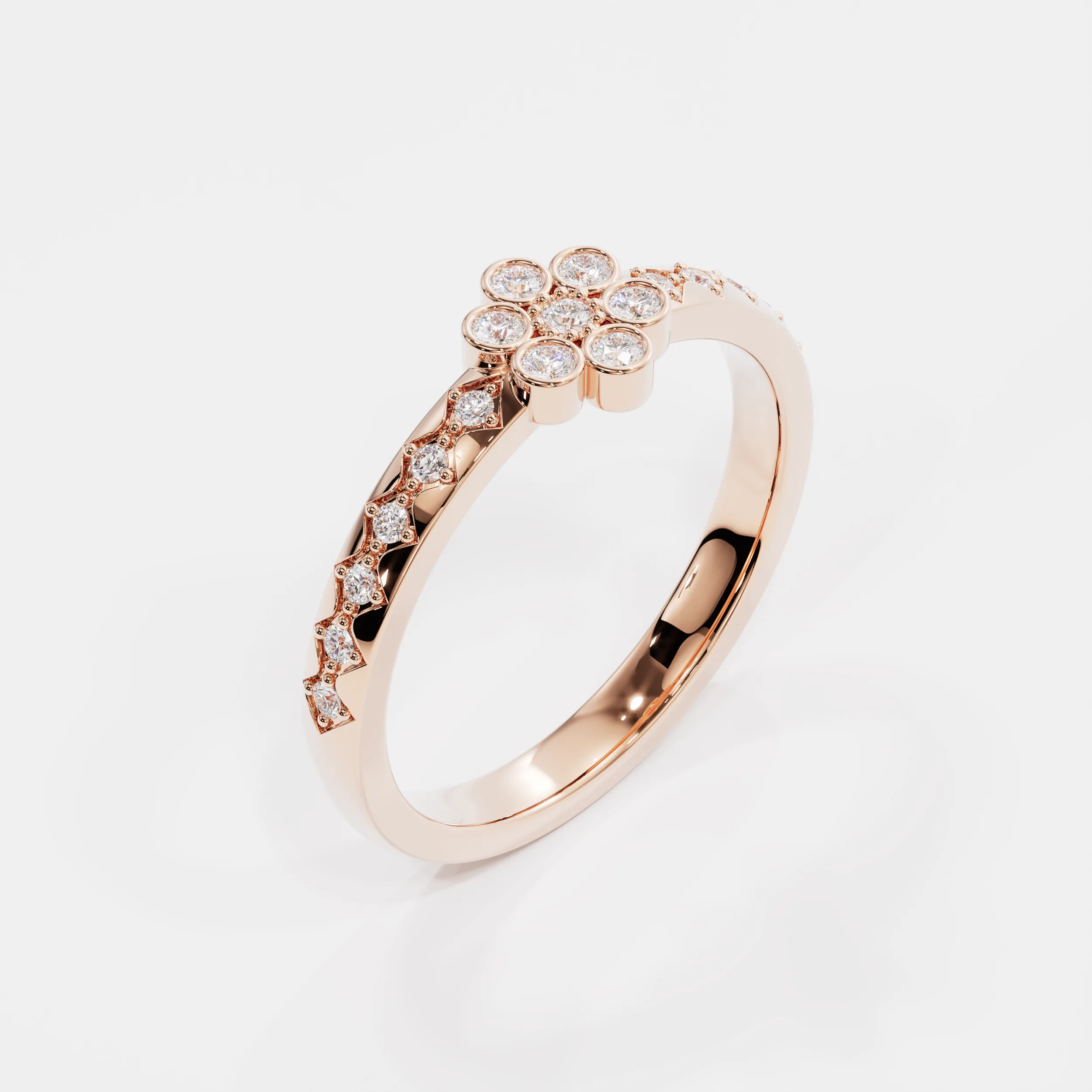 טבעת אלגנטית בעבודת צורפות מדויקת, עם שורת יהלומים עדינים המשובצים לאורך החישוק. במרכזה נמצא מוטיב פרח מעוגל, המורכב מיהלומים עגולים בליטוש מבריק, המסודרים בהרמוניה סימטרית מושלמת. השיבוץ המדורג סביב הפרח מוסיף עומק ותחכום. שילוב הרמוני של רוך ועוצמה – קלאסיקה מודרנית שקשה להוריד ממנה את העיניים.