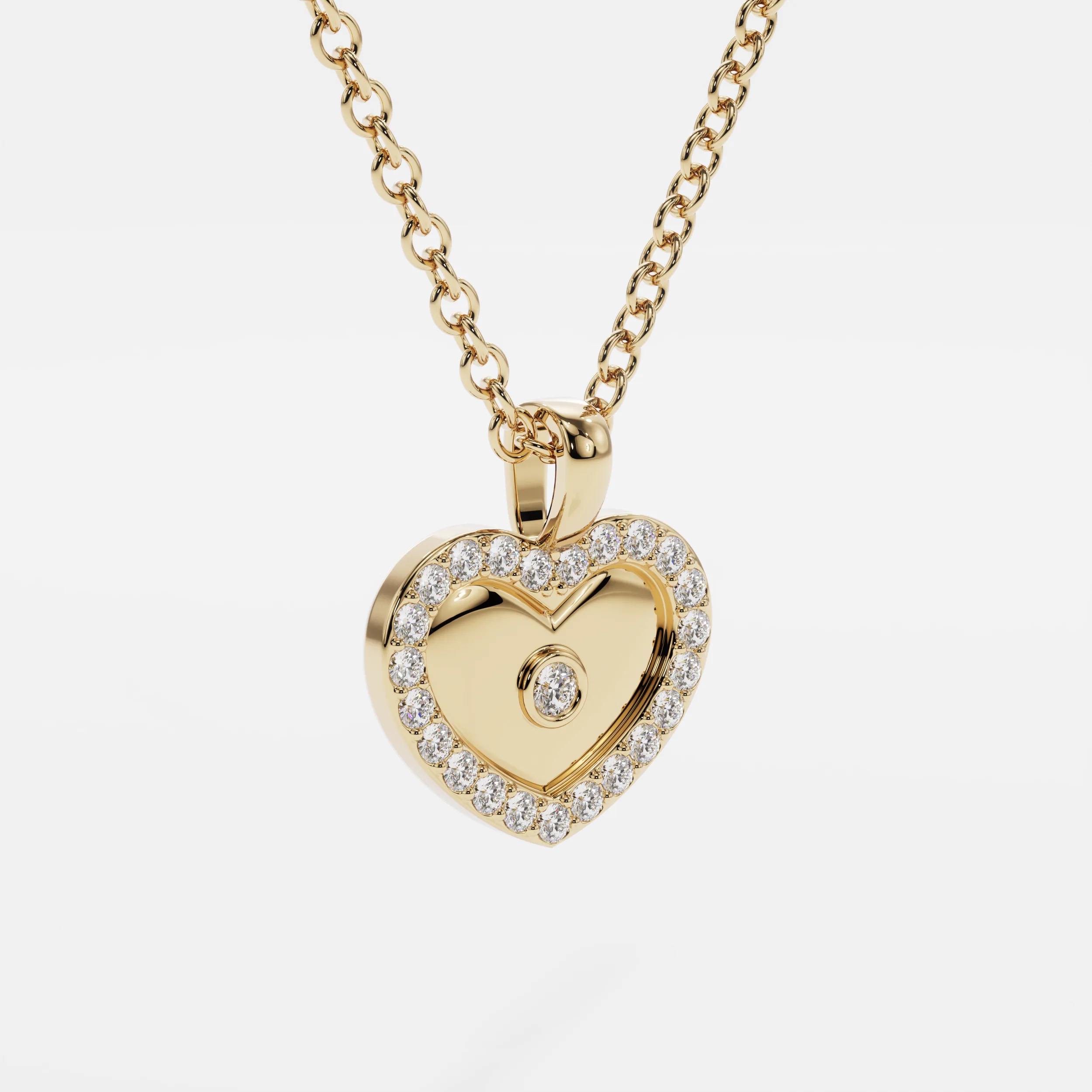 תליון יוקרתי בעיצוב לב מזהב צהוב, התלוי על שרשרת עדינה. מסגרת הלב מעוטרת בהילה מלאה של יהלומים עגולים מלוטשים, היוצרים ברק זוהר ומרשים. במרכז הלב משובץ יהלום בודד במסגרת סגורה, שמוסיף אלגנטיות ומדגיש את עומק הצורה. שילוב בין סמל אהבה קלאסי למראה מודרני ומעודן – תכשיט רומנטי ומתוחכם, מושלם כמתנה משמעותית או כתכשיט יומי מלא רגש.   גודל תליון: 15 מ"מ משקל קראט: 0.32 קראט