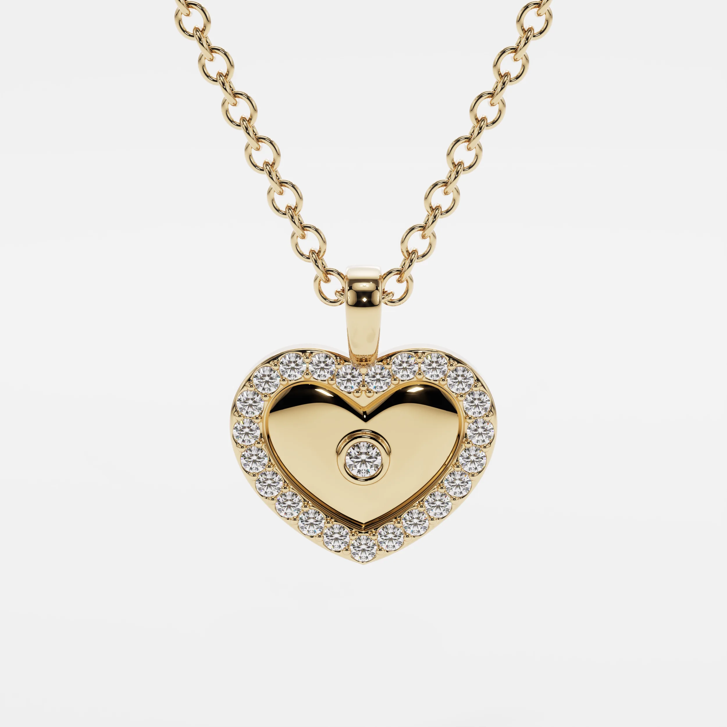 תליון לב מזהב צהוב עם הילה של יהלומים ויהלום מרכזי בודד. עיצוב רומנטי, מודרני ומלא רגש.