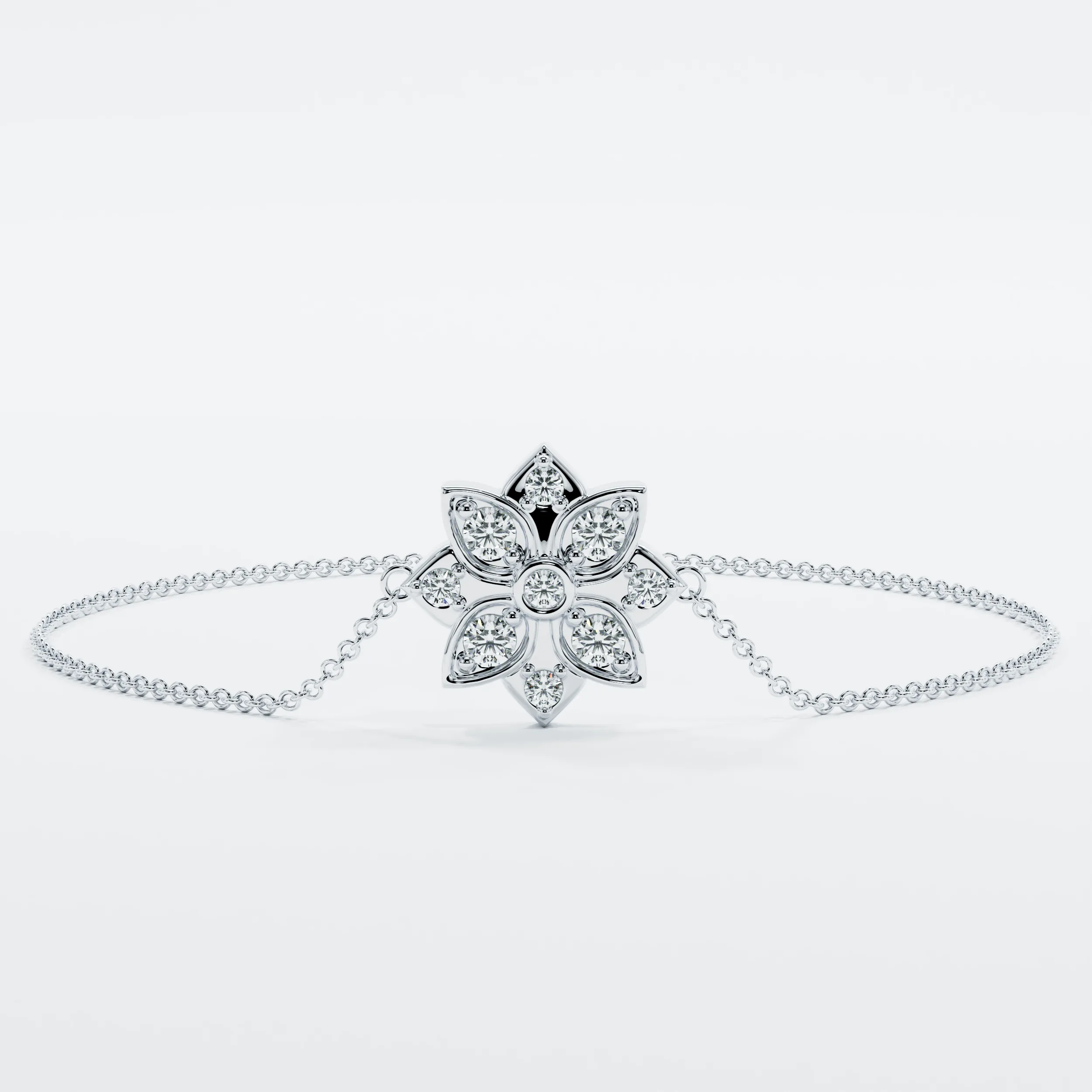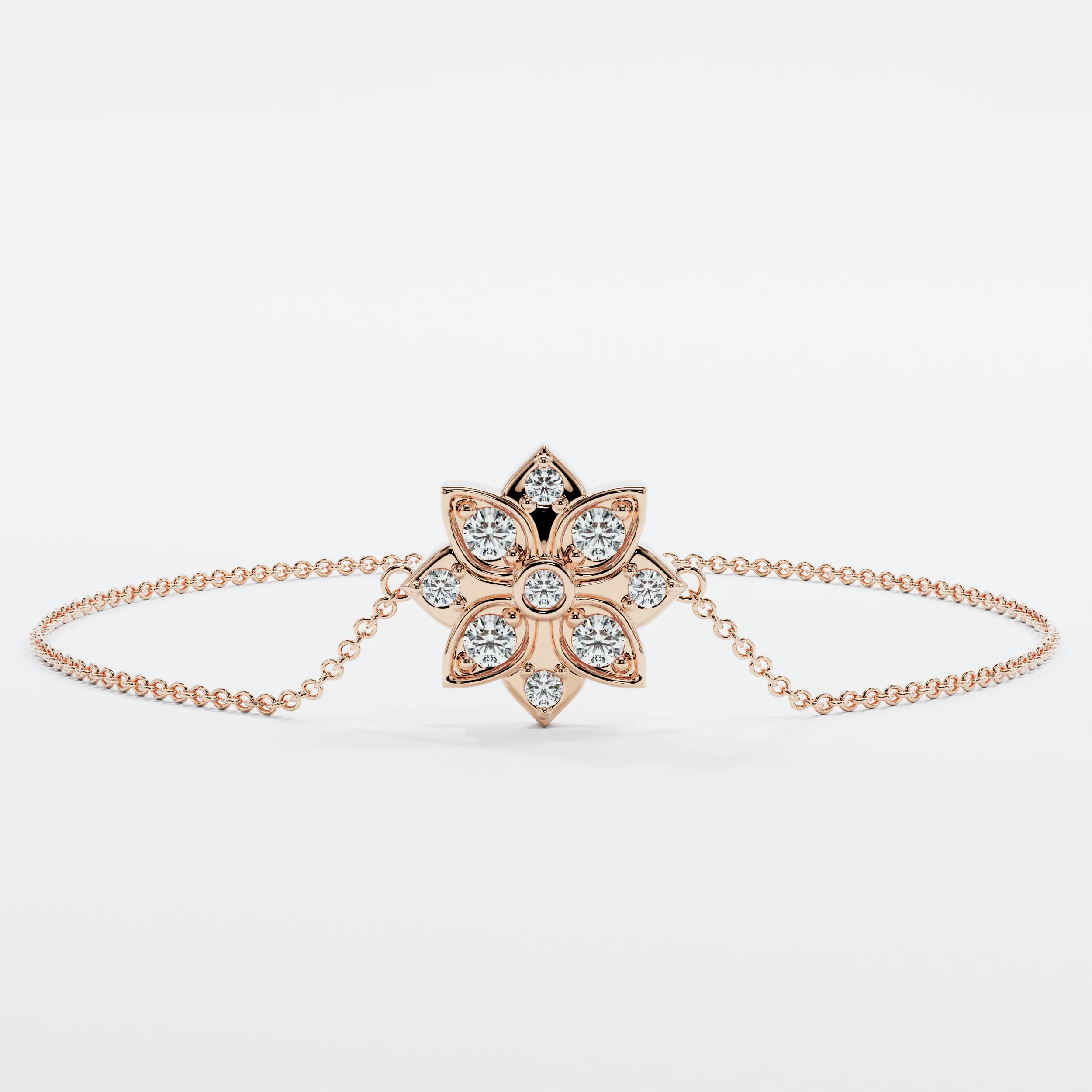 צמיד יוקרתי מזהב 14 קראט עם אלמנט מרכזי בצורת ריבוע מושלם, מעוטר בארבעה עלי כותרת עדינים בסימטריה מושלמת. כל עלה משובץ ביהלום עגול נוצץ, ובמרכז נוסף יהלום שמאיר את כל הפריט. השרשרת הדקה והאלגנטית משתלבת בהרמוניה עם המרכז, ליצירת מראה נצחי, מתוחכם ובעל נגיעה של יוקרה.   גודל תליון: 10 מ"מ משקל קראט: 0.13 ct